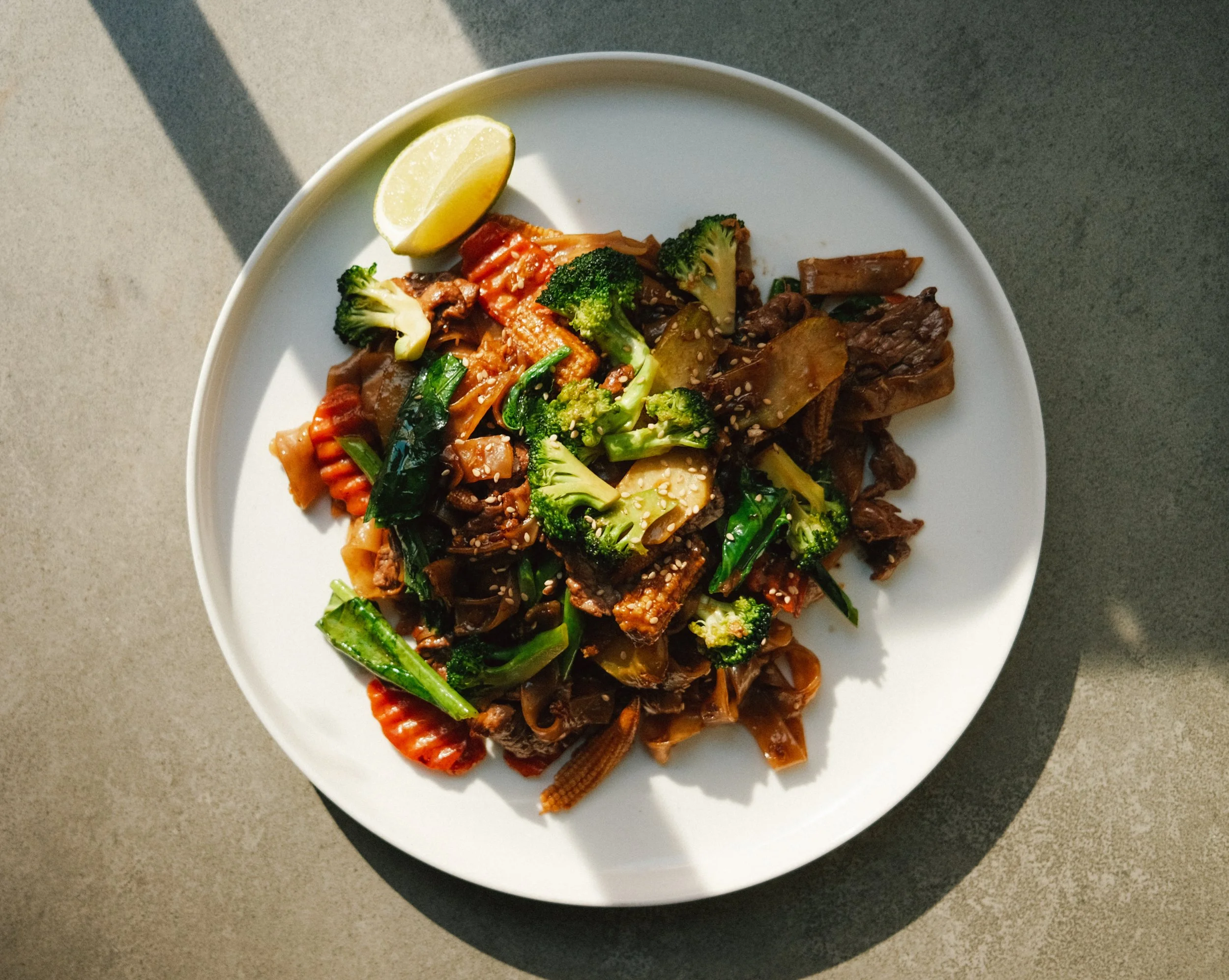 Brede rijstnoedels met malse rundsreepjes, knapperige broccolini en hartige sojasaus, vol diepe umami- en rooksmaak